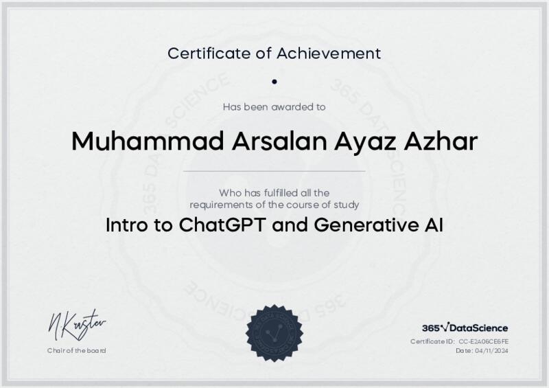 This user has been awarded the Intro to ChatGPT and Generative AI Certificate for successfully completing the course exam. Holding this certificate demonstrates their proficiency on the topic and signifies they are qualified to apply their newly acquired expertise in the fields of data analytics and data science.