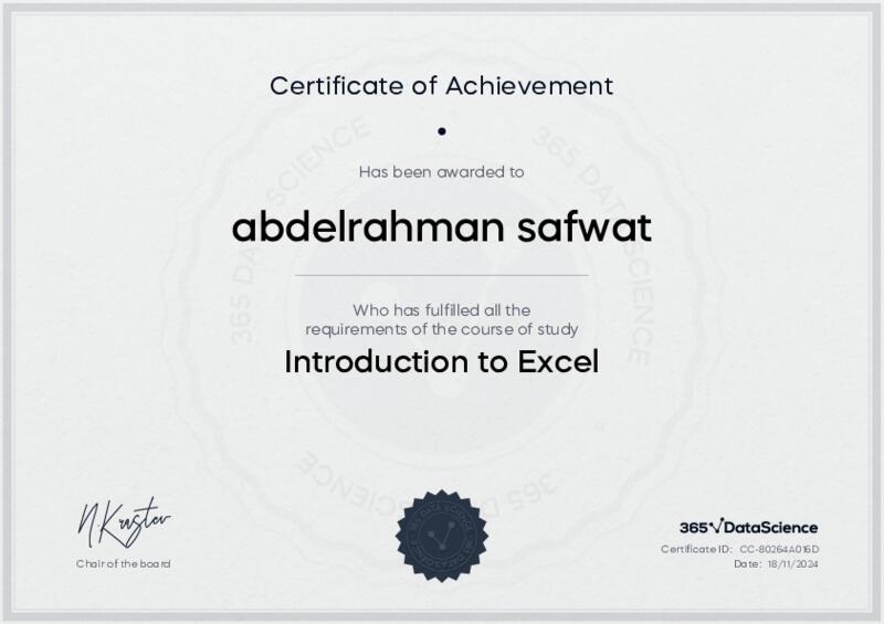 This user has been awarded the Introduction to Excel Certificate for successfully completing the course exam. Holding this certificate demonstrates their proficiency on the topic and signifies they are qualified to apply their newly acquired expertise in the fields of data analytics and data science.