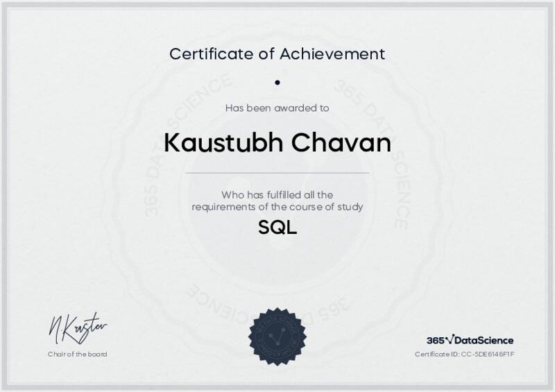 This user has been awarded the SQL Certificate for successfully completing the course exam. Holding this certificate demonstrates their proficiency on the topic and signifies they are qualified to apply their newly acquired expertise in the fields of data analytics and data science.