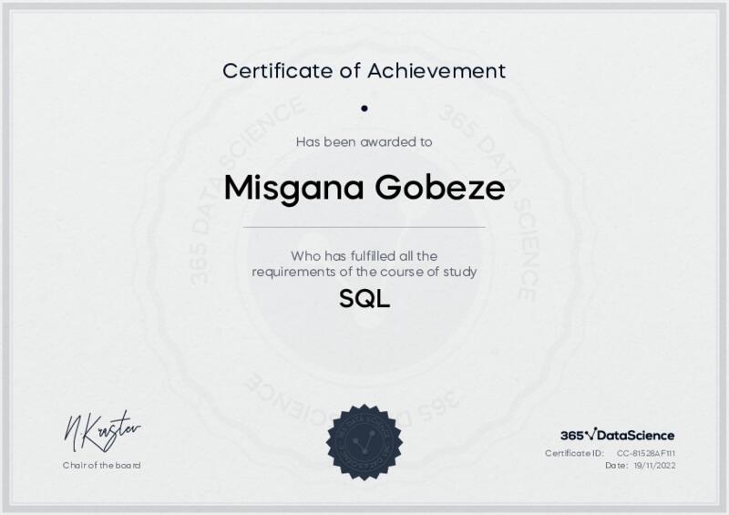 This user has been awarded the SQL Certificate for successfully completing the course exam. Holding this certificate demonstrates their proficiency on the topic and signifies they are qualified to apply their newly acquired expertise in the fields of data analytics and data science.