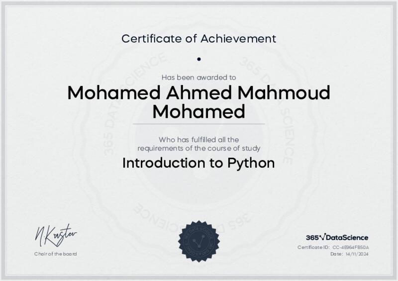 This user has been awarded the Introduction to Python Certificate for successfully completing the course exam. Holding this certificate demonstrates their proficiency on the topic and signifies they are qualified to apply their newly acquired expertise in the fields of data analytics and data science.