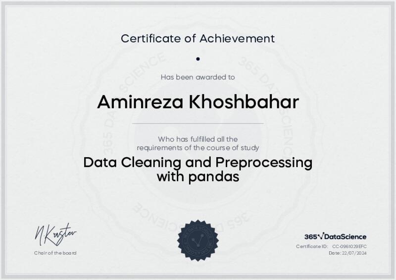 This user has been awarded the Data Cleaning and Preprocessing with pandas Certificate for successfully completing the course exam. Holding this certificate demonstrates their proficiency on the topic and signifies they are qualified to apply their newly acquired expertise in the fields of data analytics and data science.