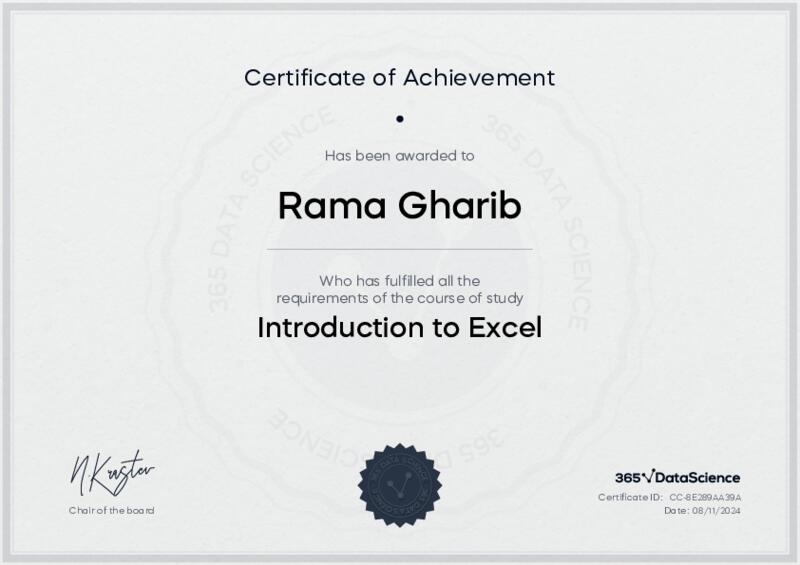 This user has been awarded the Introduction to Excel Certificate for successfully completing the course exam. Holding this certificate demonstrates their proficiency on the topic and signifies they are qualified to apply their newly acquired expertise in the fields of data analytics and data science.