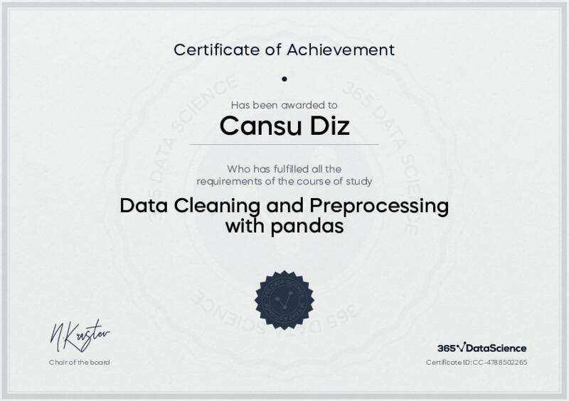 This user has been awarded the Data Cleaning and Preprocessing with pandas Certificate for successfully completing the course exam. Holding this certificate demonstrates their proficiency on the topic and signifies they are qualified to apply their newly acquired expertise in the fields of data analytics and data science.