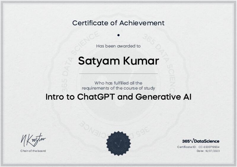 This user has been awarded the Intro to ChatGPT and Generative AI Certificate for successfully completing the course exam. Holding this certificate demonstrates their proficiency on the topic and signifies they are qualified to apply their newly acquired expertise in the fields of data analytics and data science.