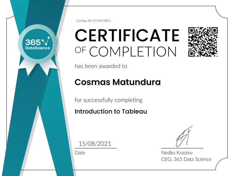 Congratulations! You have been awarded the 365 Data Science Certificate for successfully completing this course. Holding this certificate demonstrates your proficiency on the topic and your ability to apply your newly acquired expertise in the fields of data analytics and data science with confidence.