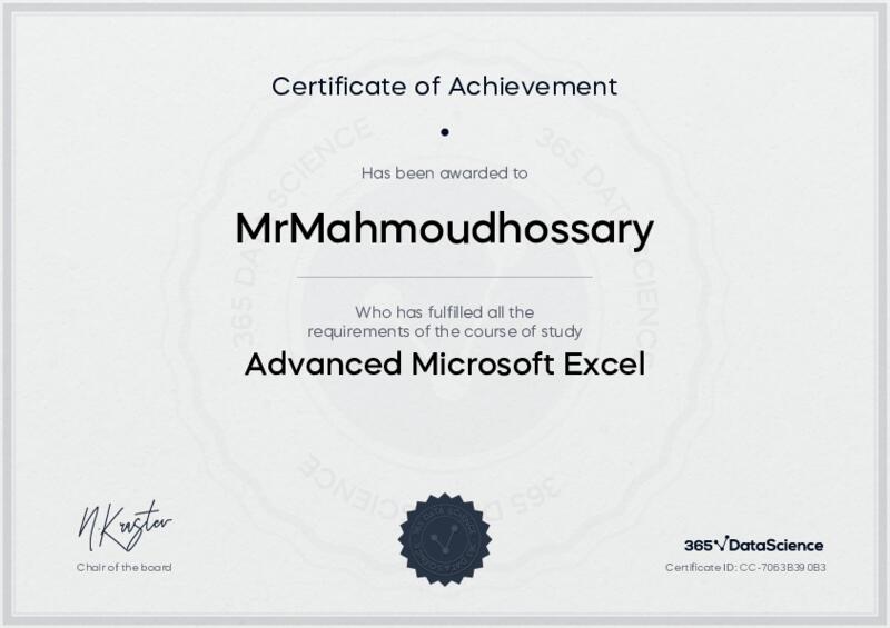 This user has been awarded the Advanced Microsoft Excel Certificate for successfully completing the course exam. Holding this certificate demonstrates their proficiency on the topic and signifies they are qualified to apply their newly acquired expertise in the fields of data analytics and data science.