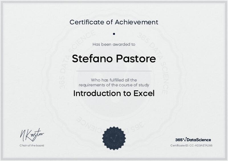 This user has been awarded the Introduction to Excel Certificate for successfully completing the course exam. Holding this certificate demonstrates their proficiency on the topic and signifies they are qualified to apply their newly acquired expertise in the fields of data analytics and data science.