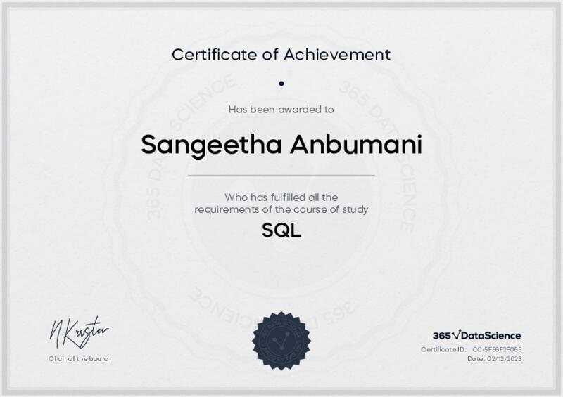 This user has been awarded the SQL Certificate for successfully completing the course exam. Holding this certificate demonstrates their proficiency on the topic and signifies they are qualified to apply their newly acquired expertise in the fields of data analytics and data science.