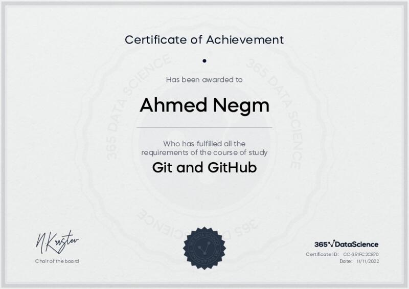 This user has been awarded the Git and GitHub Certificate for successfully completing the course exam. Holding this certificate demonstrates their proficiency on the topic and signifies they are qualified to apply their newly acquired expertise in the fields of data analytics and data science.