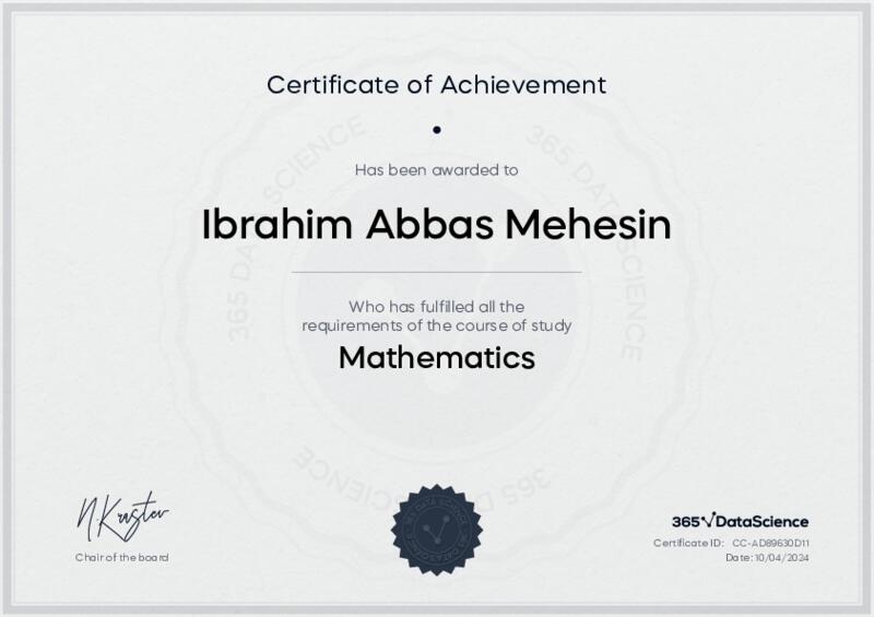 This user has been awarded the Mathematics Certificate for successfully completing the course exam. Holding this certificate demonstrates their proficiency on the topic and signifies they are qualified to apply their newly acquired expertise in the fields of data analytics and data science.