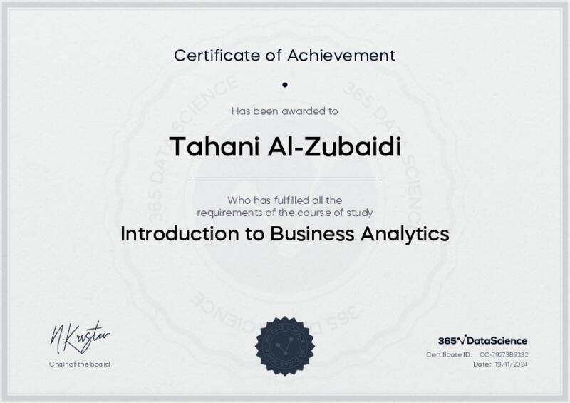 This user has been awarded the Introduction to Business Analytics Certificate for successfully completing the course exam. Holding this certificate demonstrates their proficiency on the topic and signifies they are qualified to apply their newly acquired expertise in the fields of data analytics and data science.
