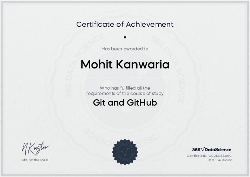 This user has been awarded the Git and GitHub Certificate for successfully completing the course exam. Holding this certificate demonstrates their proficiency on the topic and signifies they are qualified to apply their newly acquired expertise in the fields of data analytics and data science.