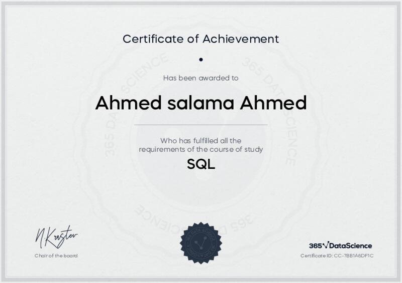 This user has been awarded the SQL Certificate for successfully completing the course exam. Holding this certificate demonstrates their proficiency on the topic and signifies they are qualified to apply their newly acquired expertise in the fields of data analytics and data science.
