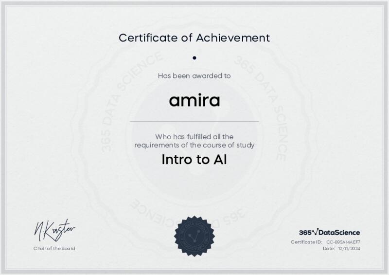 This user has been awarded the Intro to AI Certificate for successfully completing the course exam. Holding this certificate demonstrates their proficiency on the topic and signifies they are qualified to apply their newly acquired expertise in the fields of data analytics and data science.