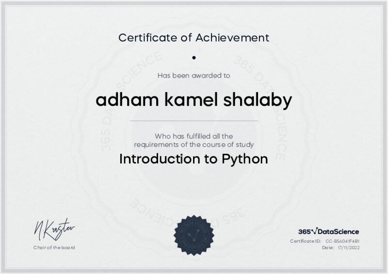 This user has been awarded the Introduction to Python Certificate for successfully completing the course exam. Holding this certificate demonstrates their proficiency on the topic and signifies they are qualified to apply their newly acquired expertise in the fields of data analytics and data science.