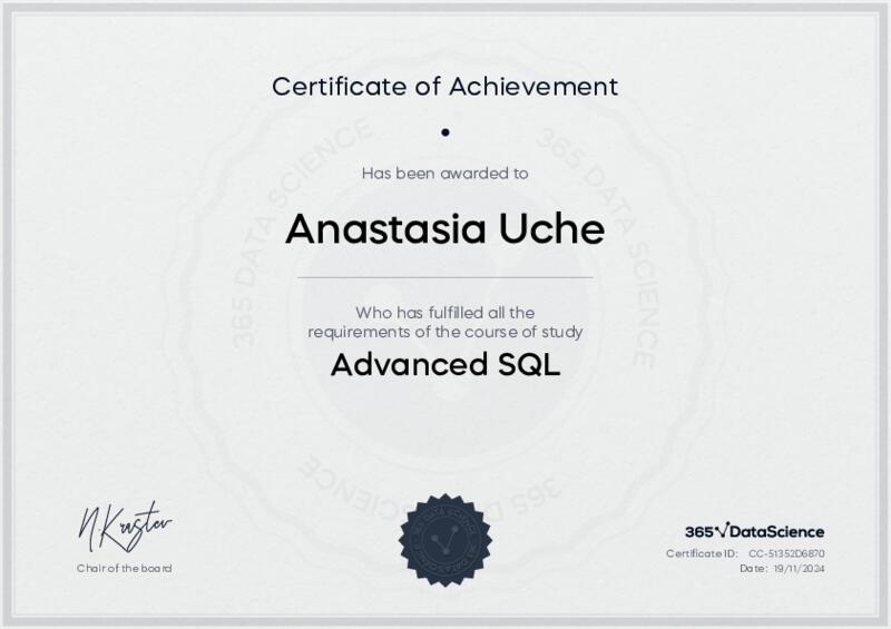 This user has been awarded the Advanced SQL Certificate for successfully completing the course exam. Holding this certificate demonstrates their proficiency on the topic and signifies they are qualified to apply their newly acquired expertise in the fields of data analytics and data science.