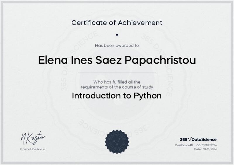 This user has been awarded the Introduction to Python Certificate for successfully completing the course exam. Holding this certificate demonstrates their proficiency on the topic and signifies they are qualified to apply their newly acquired expertise in the fields of data analytics and data science.