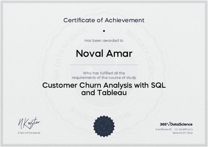 This user has been awarded the Customer Churn Analysis with SQL and Tableau Certificate for successfully completing the course exam. Holding this certificate demonstrates their proficiency on the topic and signifies they are qualified to apply their newly acquired expertise in the fields of data analytics and data science.
