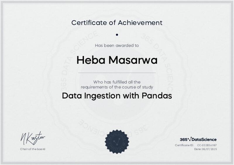 This user has been awarded the Data Ingestion with Pandas Certificate for successfully completing the course exam. Holding this certificate demonstrates their proficiency on the topic and signifies they are qualified to apply their newly acquired expertise in the fields of data analytics and data science.