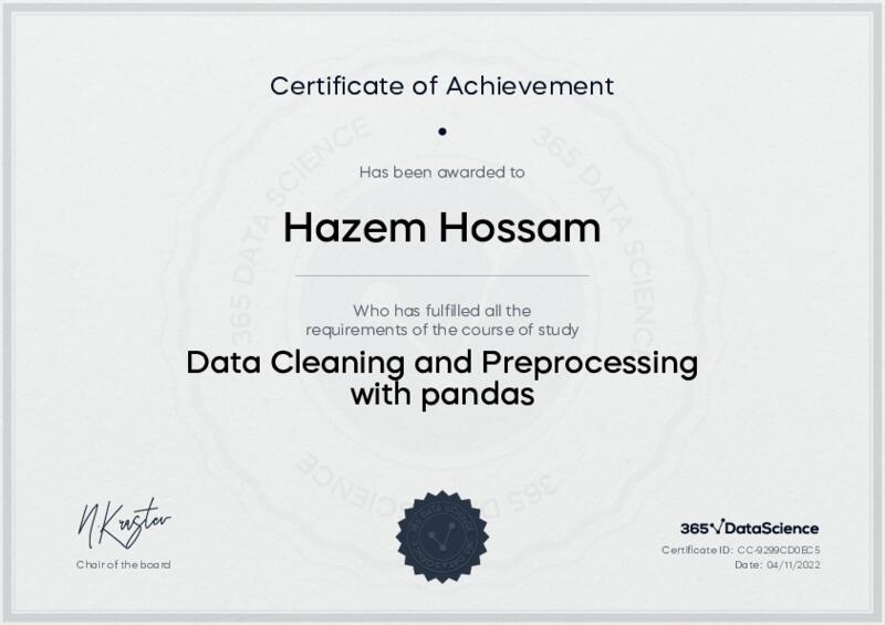 This user has been awarded the Data Cleaning and Preprocessing with pandas Certificate for successfully completing the course exam. Holding this certificate demonstrates their proficiency on the topic and signifies they are qualified to apply their newly acquired expertise in the fields of data analytics and data science.
