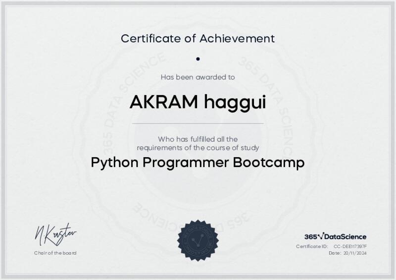This user has been awarded the Python Programmer Bootcamp Certificate for successfully completing the course exam. Holding this certificate demonstrates their proficiency on the topic and signifies they are qualified to apply their newly acquired expertise in the fields of data analytics and data science.