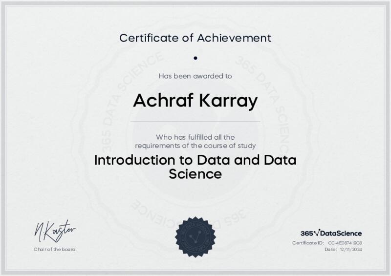 This user has been awarded the Introduction to Data and Data Science Certificate for successfully completing the course exam. Holding this certificate demonstrates their proficiency on the topic and signifies they are qualified to apply their newly acquired expertise in the fields of data analytics and data science.