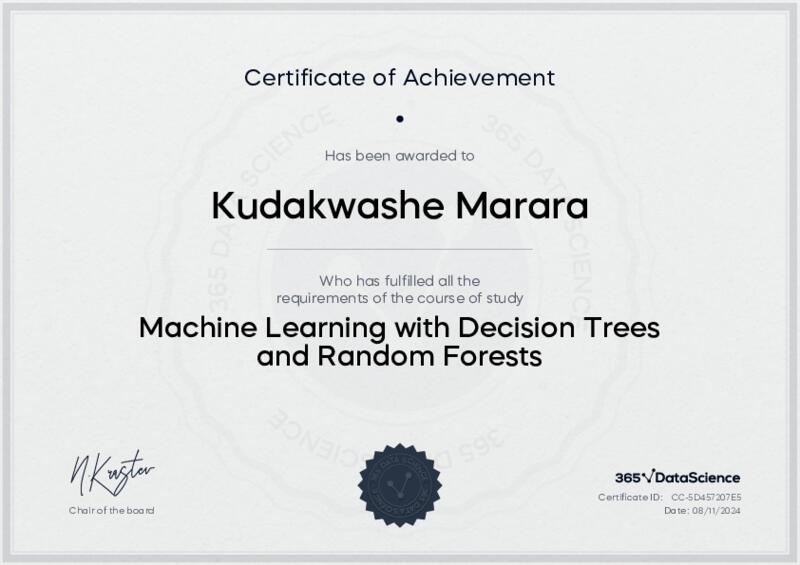This user has been awarded the Machine Learning with Decision Trees and Random Forests Certificate for successfully completing the course exam. Holding this certificate demonstrates their proficiency on the topic and signifies they are qualified to apply their newly acquired expertise in the fields of data analytics and data science.