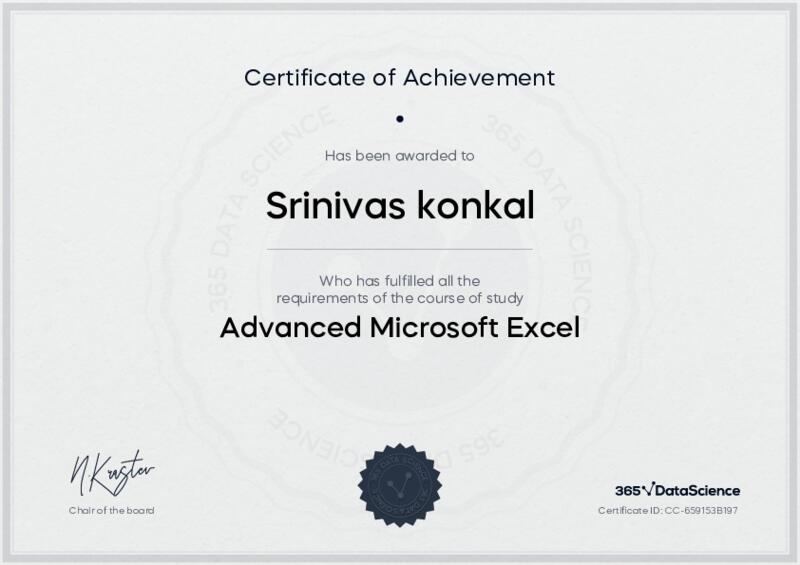 This user has been awarded the Advanced Microsoft Excel Certificate for successfully completing the course exam. Holding this certificate demonstrates their proficiency on the topic and signifies they are qualified to apply their newly acquired expertise in the fields of data analytics and data science.