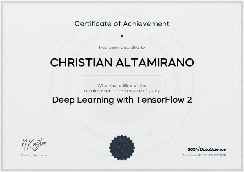This user has been awarded the Deep Learning with TensorFlow 2 Certificate for successfully completing the course exam. Holding this certificate demonstrates their proficiency on the topic and signifies they are qualified to apply their newly acquired expertise in the fields of data analytics and data science.