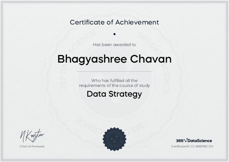This user has been awarded the Data Strategy Certificate for successfully completing the course exam. Holding this certificate demonstrates their proficiency on the topic and signifies they are qualified to apply their newly acquired expertise in the fields of data analytics and data science.