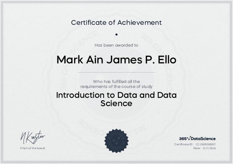 This user has been awarded the Introduction to Data and Data Science Certificate for successfully completing the course exam. Holding this certificate demonstrates their proficiency on the topic and signifies they are qualified to apply their newly acquired expertise in the fields of data analytics and data science.