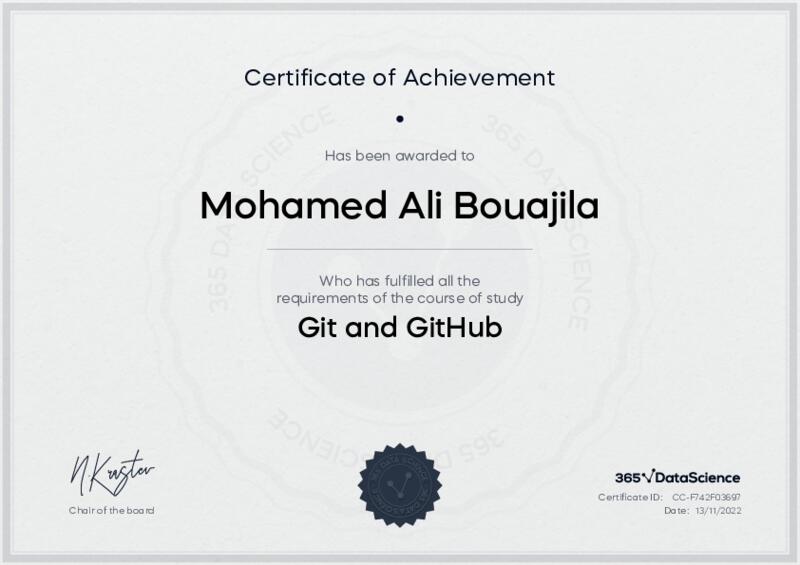 This user has been awarded the Git and GitHub Certificate for successfully completing the course exam. Holding this certificate demonstrates their proficiency on the topic and signifies they are qualified to apply their newly acquired expertise in the fields of data analytics and data science.