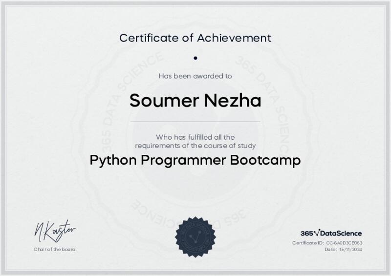 This user has been awarded the Python Programmer Bootcamp Certificate for successfully completing the course exam. Holding this certificate demonstrates their proficiency on the topic and signifies they are qualified to apply their newly acquired expertise in the fields of data analytics and data science.