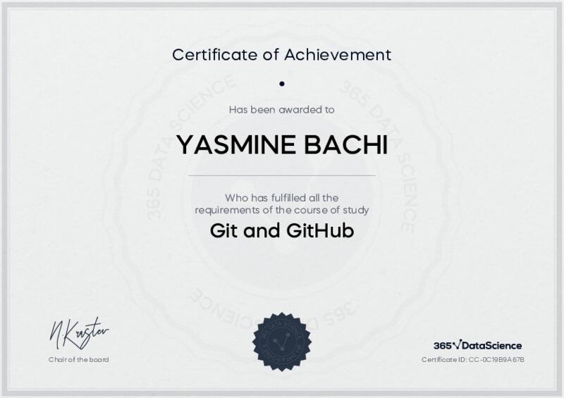 This user has been awarded the Git and GitHub Certificate for successfully completing the course exam. Holding this certificate demonstrates their proficiency on the topic and signifies they are qualified to apply their newly acquired expertise in the fields of data analytics and data science.