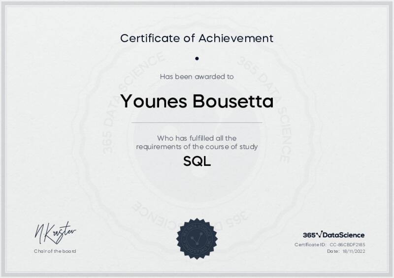 This user has been awarded the SQL Certificate for successfully completing the course exam. Holding this certificate demonstrates their proficiency on the topic and signifies they are qualified to apply their newly acquired expertise in the fields of data analytics and data science.