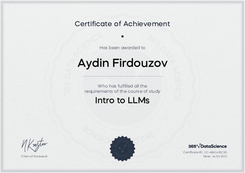 This user has been awarded the Intro to LLMs Certificate for successfully completing the course exam. Holding this certificate demonstrates their proficiency on the topic and signifies they are qualified to apply their newly acquired expertise in the fields of data analytics and data science.