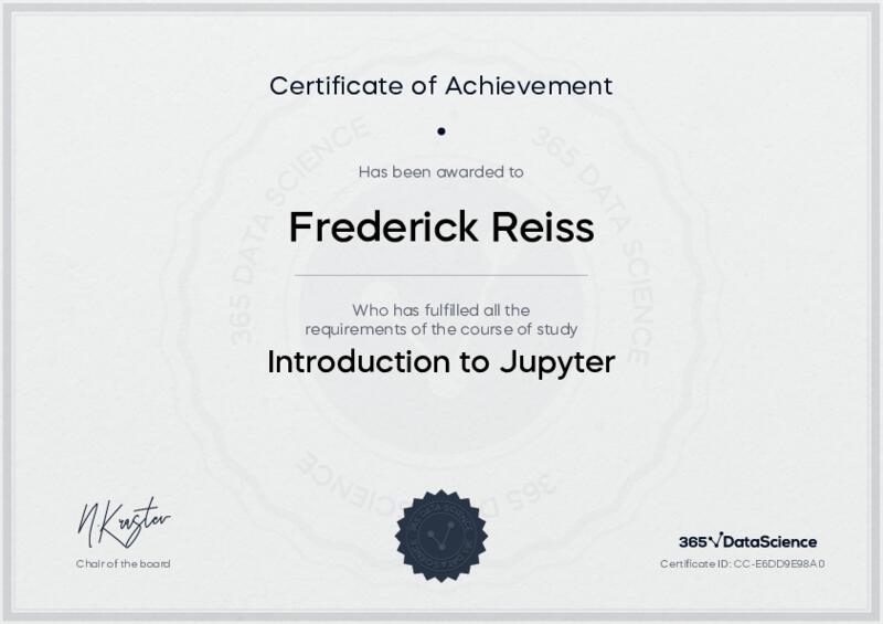 This user has been awarded the Introduction to Jupyter Certificate for successfully completing the course exam. Holding this certificate demonstrates their proficiency on the topic and signifies they are qualified to apply their newly acquired expertise in the fields of data analytics and data science.