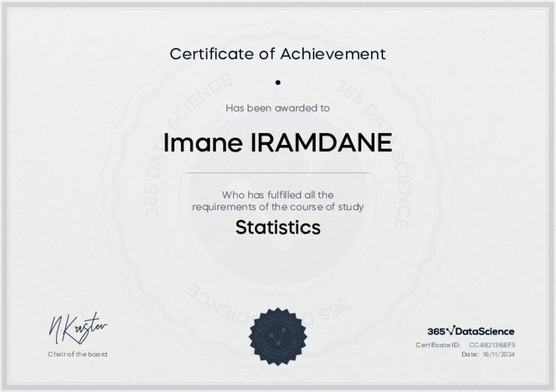 This user has been awarded the Statistics Certificate for successfully completing the course exam. Holding this certificate demonstrates their proficiency on the topic and signifies they are qualified to apply their newly acquired expertise in the fields of data analytics and data science.