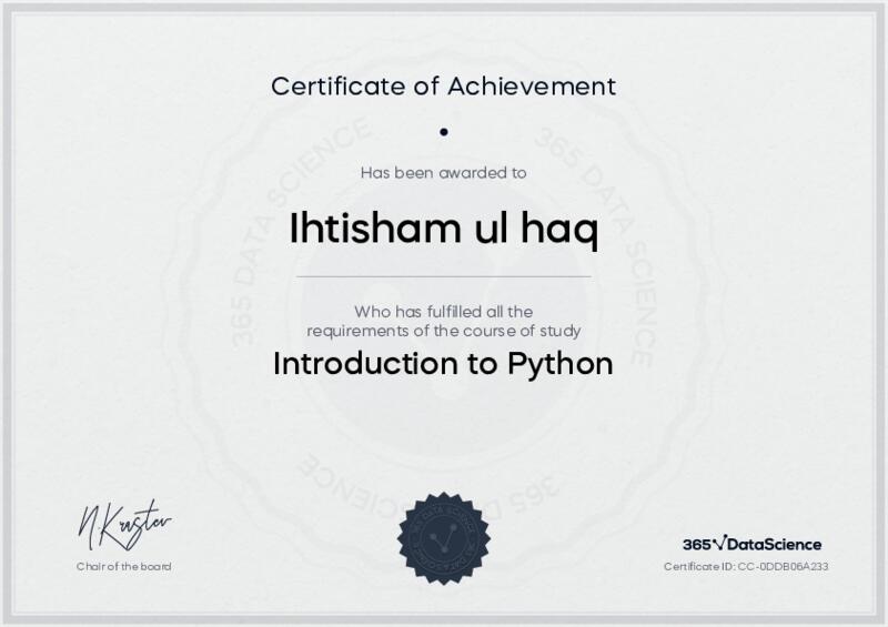 This user has been awarded the Introduction to Python Certificate for successfully completing the course exam. Holding this certificate demonstrates their proficiency on the topic and signifies they are qualified to apply their newly acquired expertise in the fields of data analytics and data science.