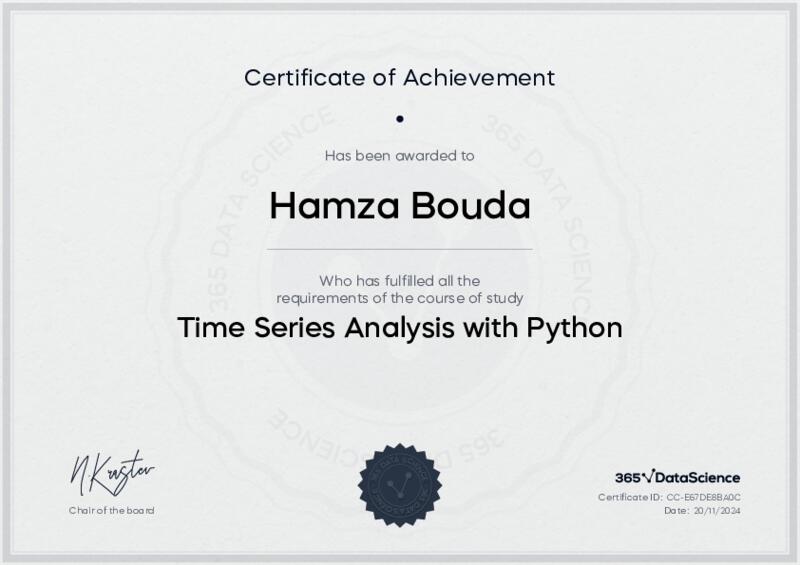 This user has been awarded the Time Series Analysis with Python Certificate for successfully completing the course exam. Holding this certificate demonstrates their proficiency on the topic and signifies they are qualified to apply their newly acquired expertise in the fields of data analytics and data science.