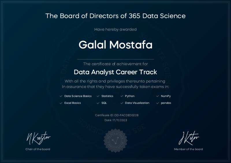 This user has been awarded the Data Analyst Career Track Certificate for successfully completing all courses and assessments. This certificate confirms their technical expertise and professional credibility to work as a data analyst.