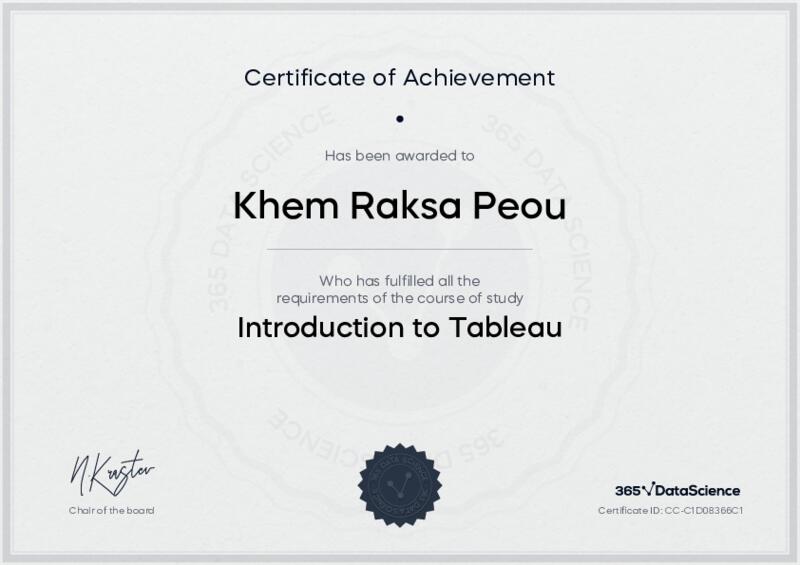 This user has been awarded the Introduction to Tableau Certificate for successfully completing the course exam. Holding this certificate demonstrates their proficiency on the topic and signifies they are qualified to apply their newly acquired expertise in the fields of data analytics and data science.