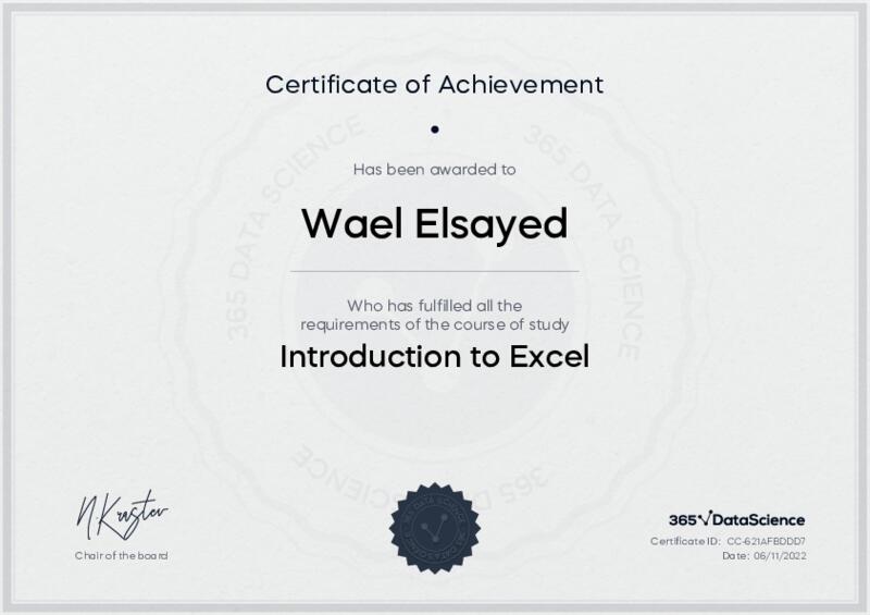 This user has been awarded the Introduction to Excel Certificate for successfully completing the course exam. Holding this certificate demonstrates their proficiency on the topic and signifies they are qualified to apply their newly acquired expertise in the fields of data analytics and data science.