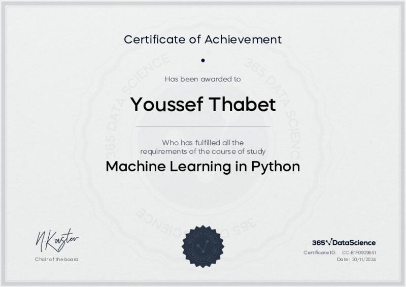This user has been awarded the Machine Learning in Python Certificate for successfully completing the course exam. Holding this certificate demonstrates their proficiency on the topic and signifies they are qualified to apply their newly acquired expertise in the fields of data analytics and data science.