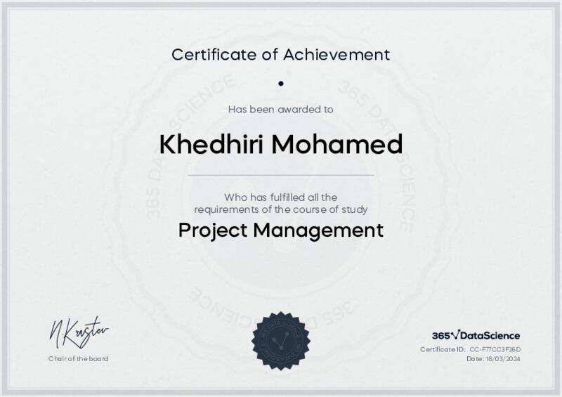 This user has been awarded the Project Management Certificate for successfully completing the course exam. Holding this certificate demonstrates their proficiency on the topic and signifies they are qualified to apply their newly acquired expertise in the fields of data analytics and data science.