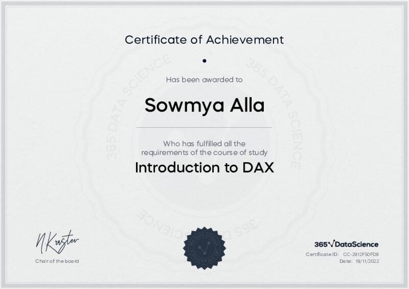 This user has been awarded the Introduction to DAX Certificate for successfully completing the course exam. Holding this certificate demonstrates their proficiency on the topic and signifies they are qualified to apply their newly acquired expertise in the fields of data analytics and data science.