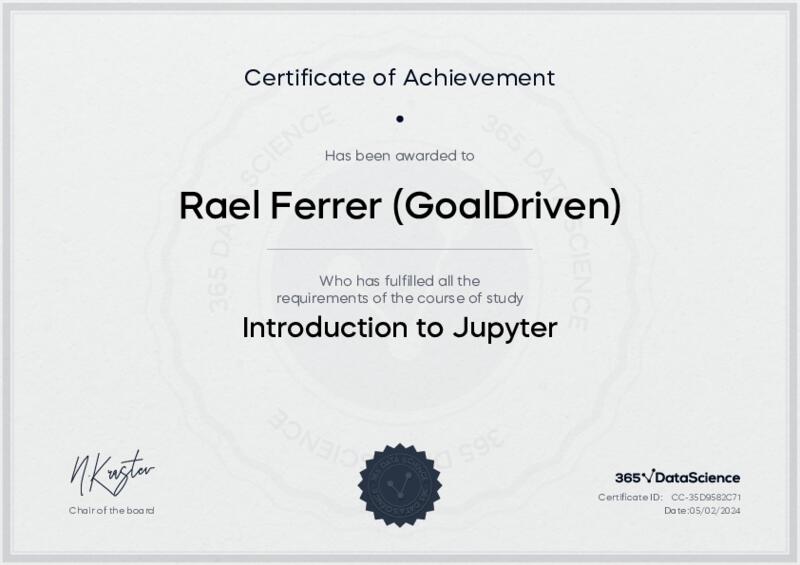 This user has been awarded the Introduction to Jupyter Certificate for successfully completing the course exam. Holding this certificate demonstrates their proficiency on the topic and signifies they are qualified to apply their newly acquired expertise in the fields of data analytics and data science.