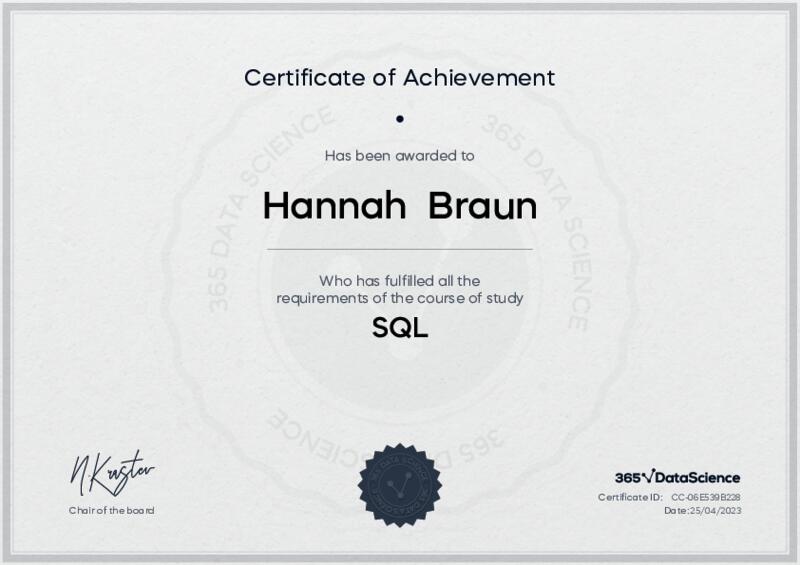 This user has been awarded the SQL Certificate for successfully completing the course exam. Holding this certificate demonstrates their proficiency on the topic and signifies they are qualified to apply their newly acquired expertise in the fields of data analytics and data science.