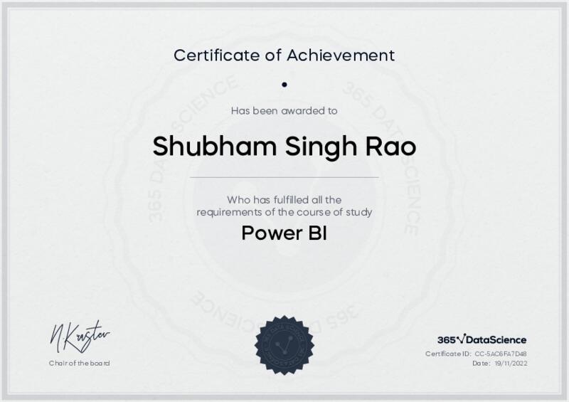 This user has been awarded the Power BI Certificate for successfully completing the course exam. Holding this certificate demonstrates their proficiency on the topic and signifies they are qualified to apply their newly acquired expertise in the fields of data analytics and data science.